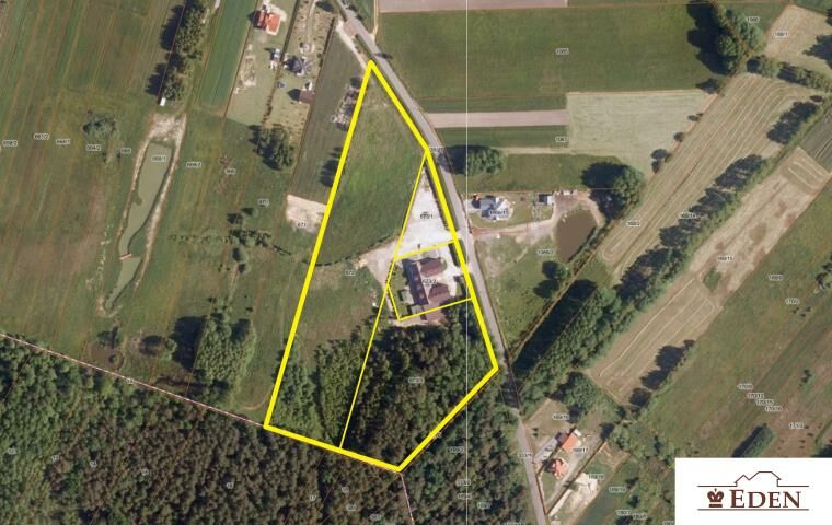 W skład całej posesji wchodzą cztery numery działek o łącznej powierzchni ponad 3 ha i szerokości wzdłuż ulicy ponad 180 m gdzie każda posiada osobny wjazd z drogi asfaltowej.